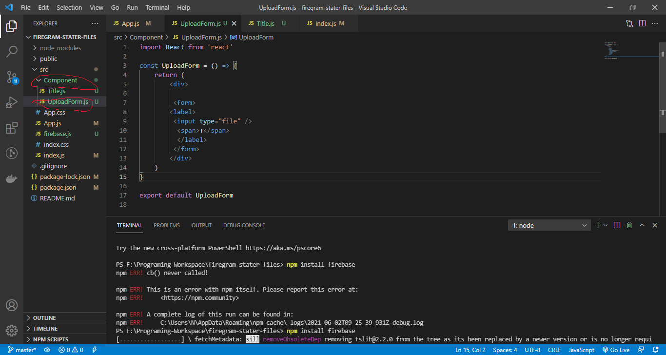 Next create one folder inside src called Component. Inside the folder create one file UploadForm.js
